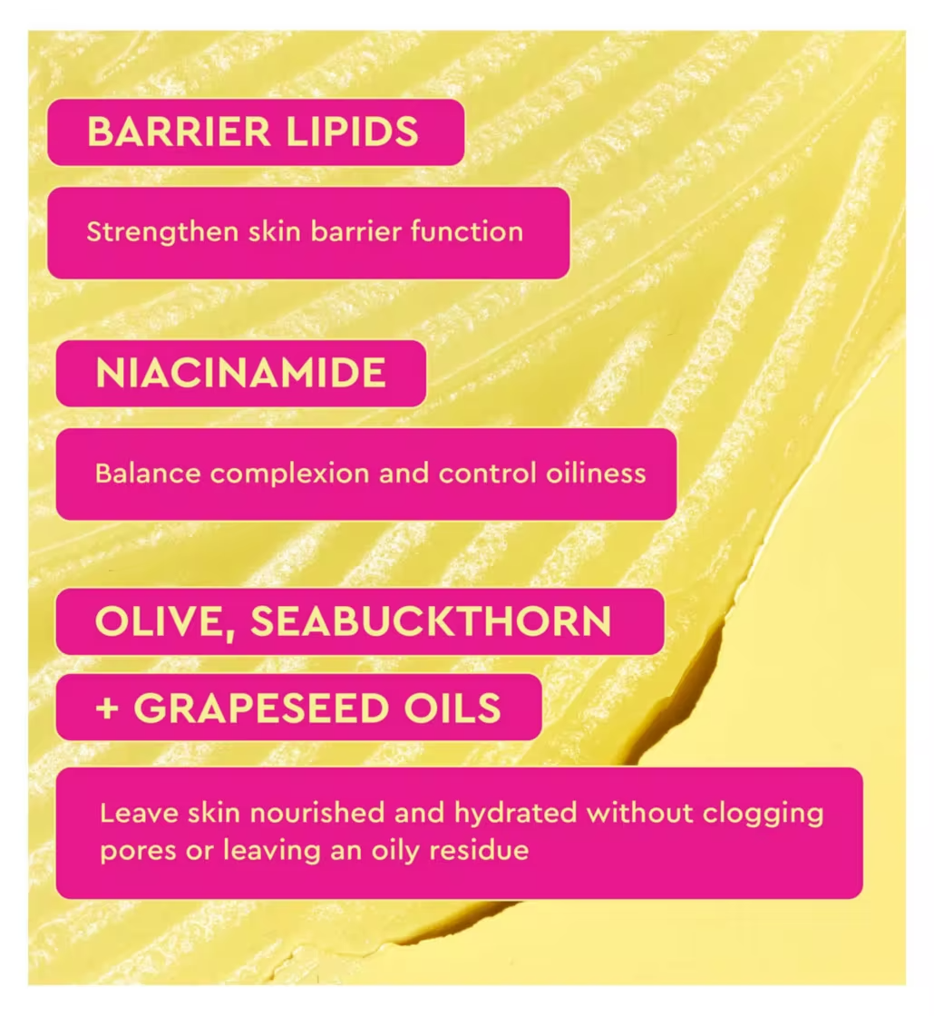 Olive Fruit, sea buckthorn and grapeseed oils nourish and hydrate skin, without clogging pores or leaving an oily residue. This restorative and lightweight formula works with Niacinamide to help balance skin and control oiliness.